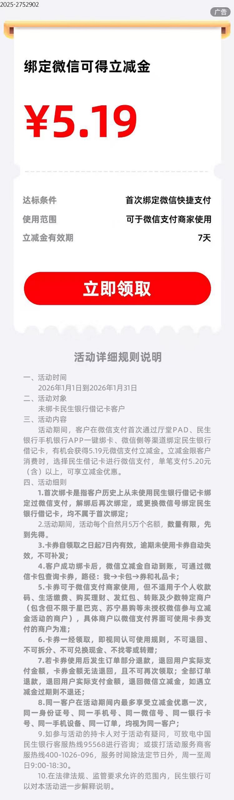 民生借记卡首次绑定微信快捷支付可得5.19元立减金